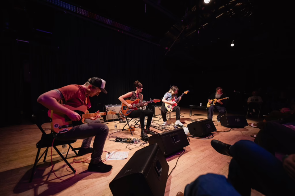 Musical Style: The music lives at the intersection of rhythmic precision and open-ended interplay. Each guitarist uses a custom-tuned four-string instrument, creating a tapestry of repeating motifs, fragmented melodies, and layered counterpoints. Some sections are tightly locked; others break open into expressive bursts and wild exchanges. The tones range from warm and woody to raw and buzzing, prioritizing dynamic shifts and collective tension over traditional harmony or melody.